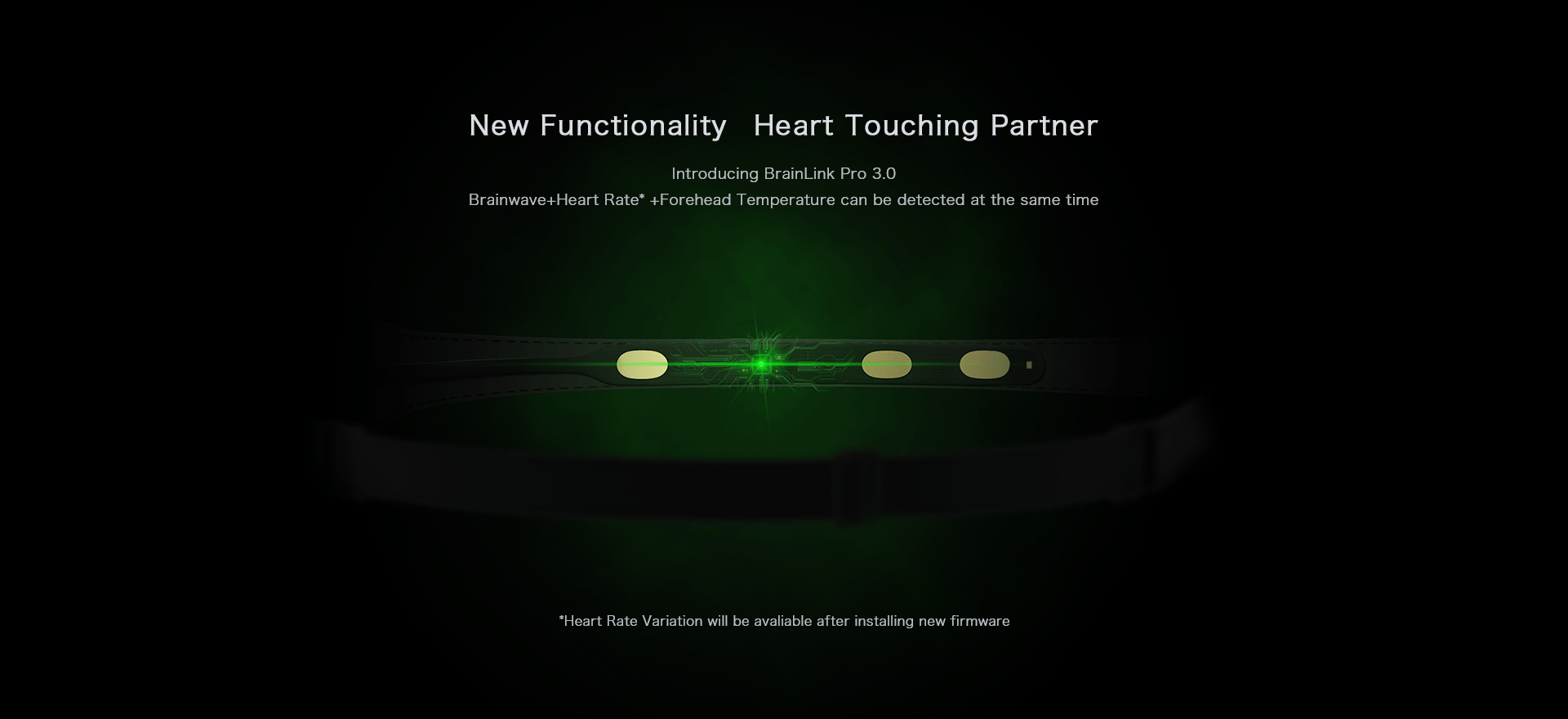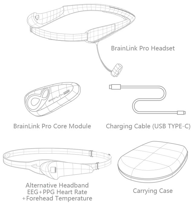 این محصول شامل هدبند با قابلیت سنجش نرخ ضربان قلب، دمای بدن (پیشانی) و جهت حرکات سر (G Sensor) میباشد. همچنین میتوان در نرمافزار مربوطه ظرفیت باتری را نیز مشاهده کرد.